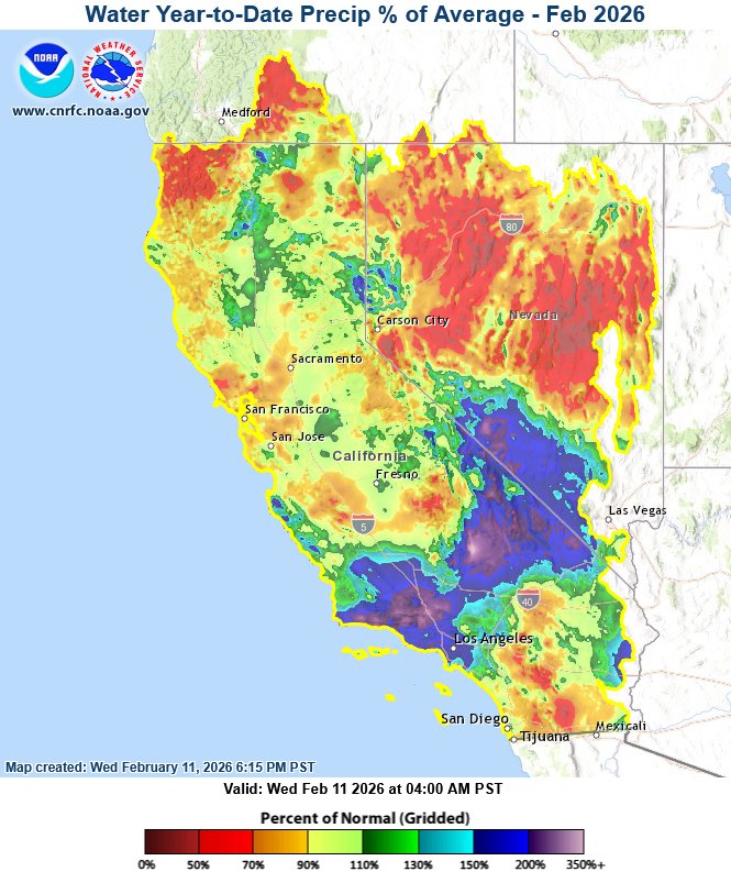 So has this dry spell affected our seasonal precipitation? Not substantially. Below, I will show how other winters compare, but first, here is a map showing "water year" precipitation percentage of normal to date (note that the "water year" is defined by the United States Geological Survey as being from 1 October through 30 September of the following year (so we're currently in "Water Year 2026" which extends from 1 Oct 2025-30 Sep 2026; this offset from the calendar year or the traditional California 1 July through 30 June period is because stream levels are typically lower in many parts of the US around September or October, and snowfall in the mountains, which is an important part of the western US water supply, mostly hasn't gotten started yet). I think the water year generally meets our needs here for "season to date" precipitation, though once in a while, we get substantial precipitation before 1 Oct, such as with former Hurricane Hilary in 2023, which can have major impacts on the fire weather season in autumn. Anyway, back to The map: it is from the California-Nevada River Forecast Center (CNRFC, part of the National Weather Service) website, which can be found at https://www.cnrfc.noaa.gov/?product=QPEWYPercentNormal&PNGtypeID=QPEWYPercentNormal.