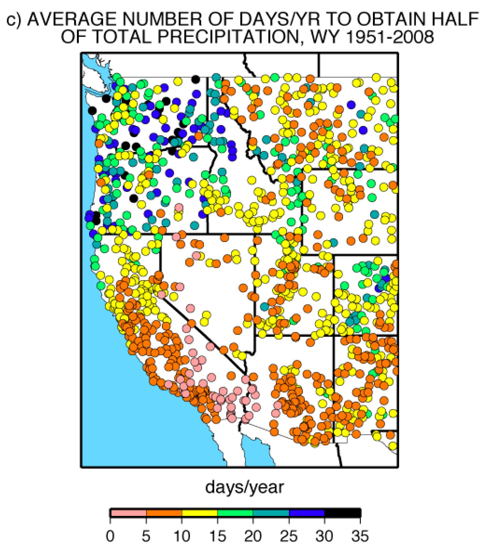One of the important things with precipitation in southern California is how much can fall on so few of days, or in a short time period. I like this image from Michael Dettinger, retired hydroclimatologist from Scripps Institution of Oceanography, which shows if one were to pick out the wettest days of the year, how many would be required to reach half the annual precipitation, on average (Source: https://www.mdpi.com/2073-4441/3/2/445 (Dettinger, et al.: "Atmospheric Rivers, Floods and the Water Resources of California", Water, 2011, 3(2), 445-478):
