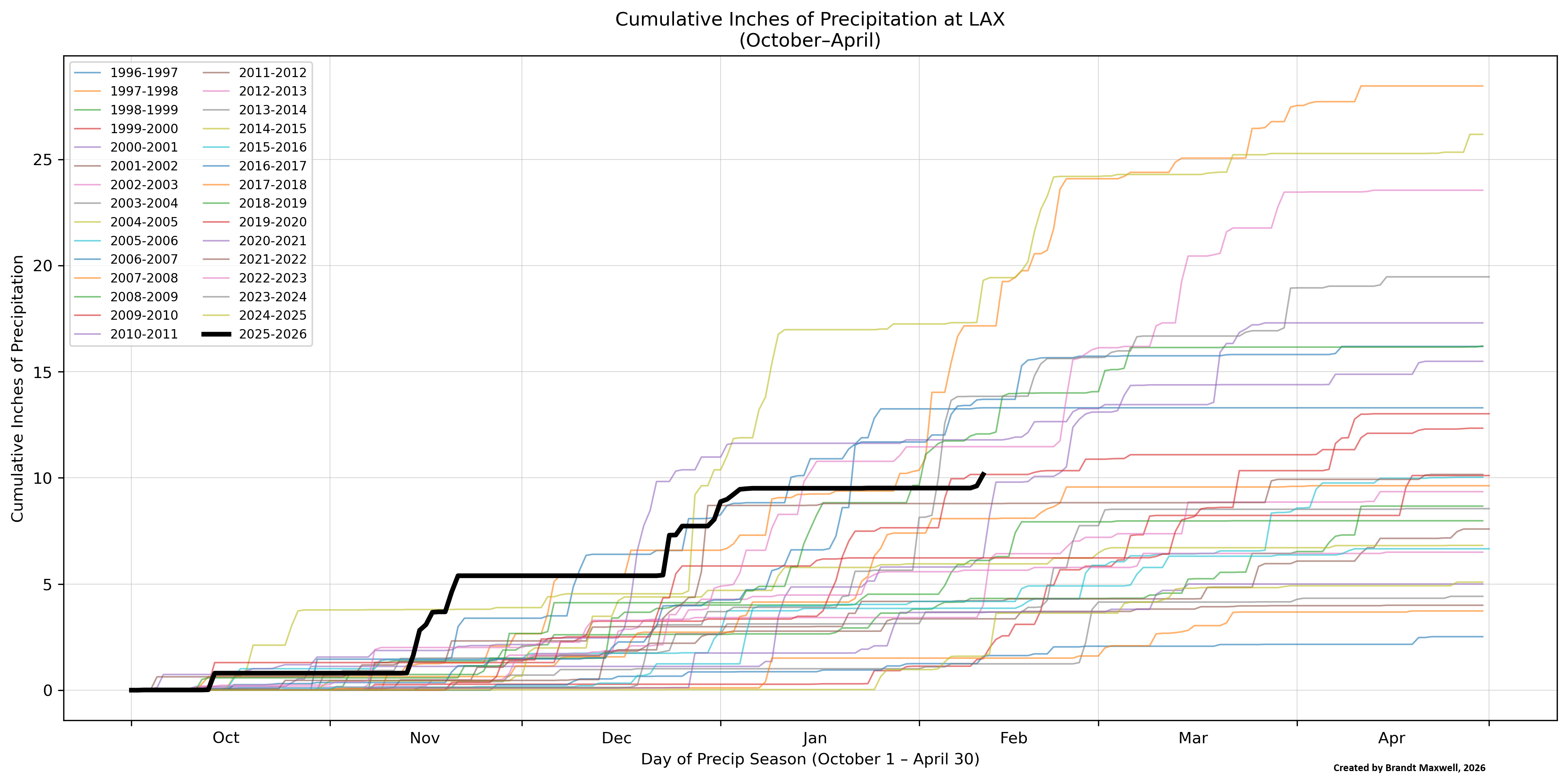 Here is a different type of graph that some of you probably haven't seen. This is a graph showing how much precipitation had fallen since 1 Oct for all of the past 30 years (including 2025-2026 which is shown in bold black) up to a given date. I stopped the graph at April since in most of Southern California, little precipitation falls after that. In the graph, the flat lines show the periods when no rain has occurred, but where the lines are almost vertical illustrate the periods of heavier rainfall. This sort of "horse race" graphic is for San Diego (SAN):