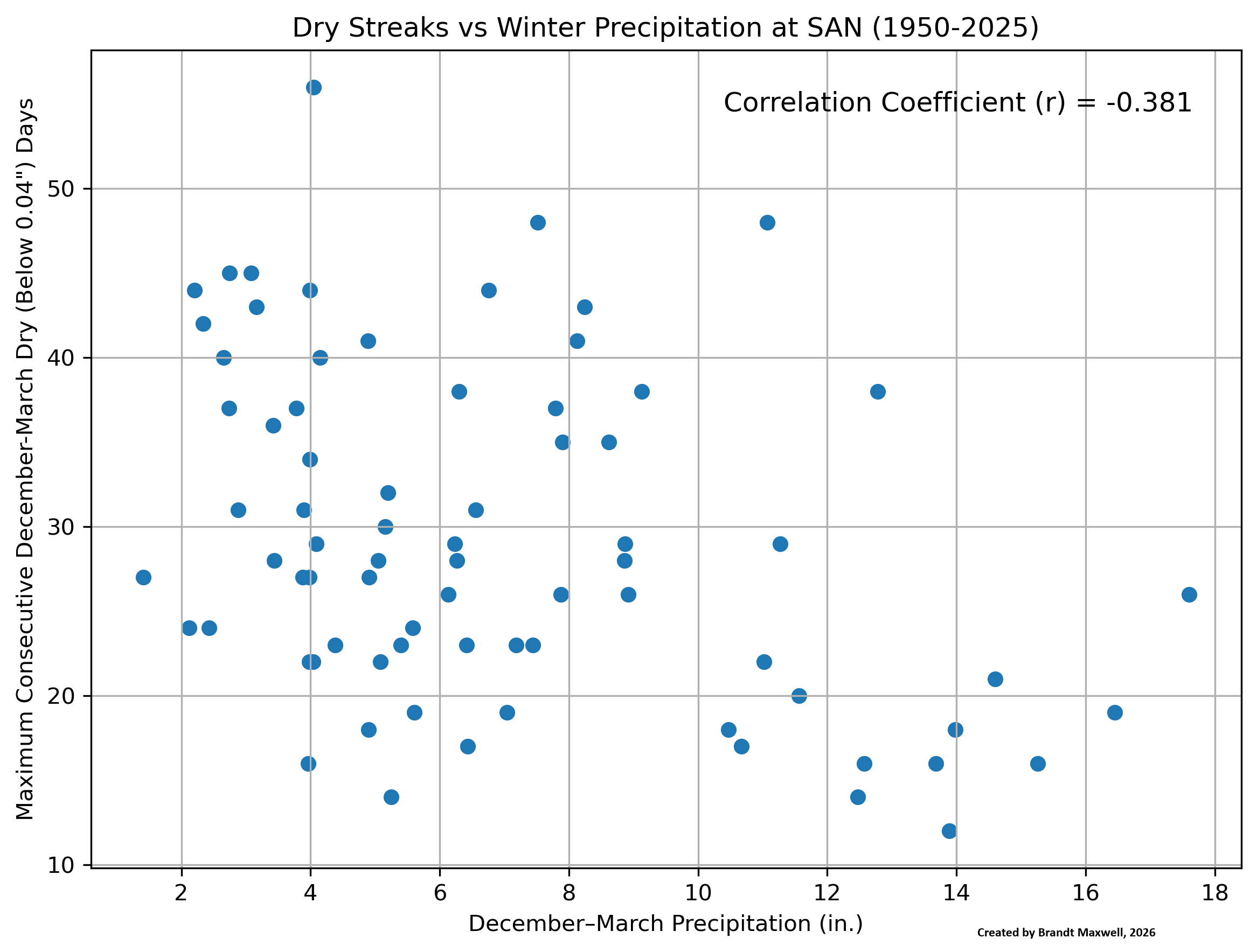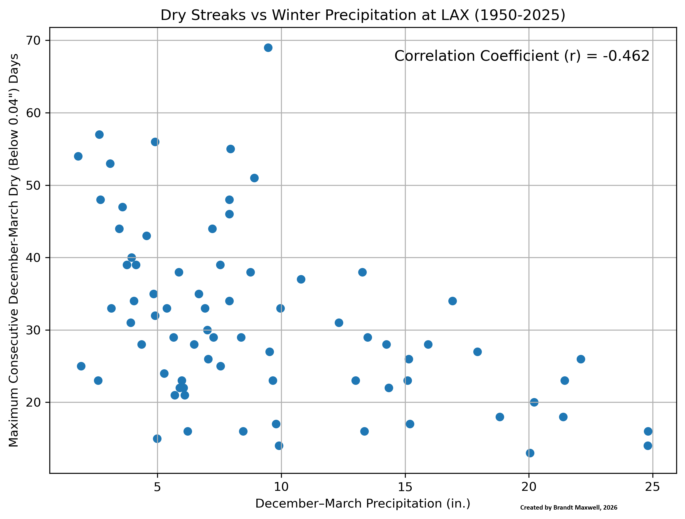 San Diego Top 5: Winter Days Dec-Mar Precip 2024-2025: 56 (4.05") 1985-1986: 48 (7.52") 1990-1991: 48 (11.07") 2005-2006: 45 (3.08") 2013-2014: 45 (2.75") Average Dec-Mar Precip: 6.90" (1950-2025) Los Angeles Top 5: Winter Days Dec-Mar Precip 2021-2022: 69 (9.47") 1983-1984: 57 (2.65") 2024-2025: 56 (4.90") 1999-2000: 55 (7.95") 1960-1961: 54 (1.79") Average Dec-Mar Precip: 9.25" (1950-2025)Note that two of the winters with the longest streaks were above normal for precipitation at SAN and one was above normal at LAX. However, there were notable dry winters too with long dry streaks, such as 2005-2006, 2013-2014, and 2024-2025 at SAN and 1960-1961, 1983-1984, and (again) 2024-2025 at LAX. The amazing thing is that there was no daily precipitation at LAX of at least 0.04" between 18 Jan 2022 and 27 Mar 2022 (69 days) despite being slightly above normal for that winter (it helped that December had over 8" of rain--more on that situation in a bit!).