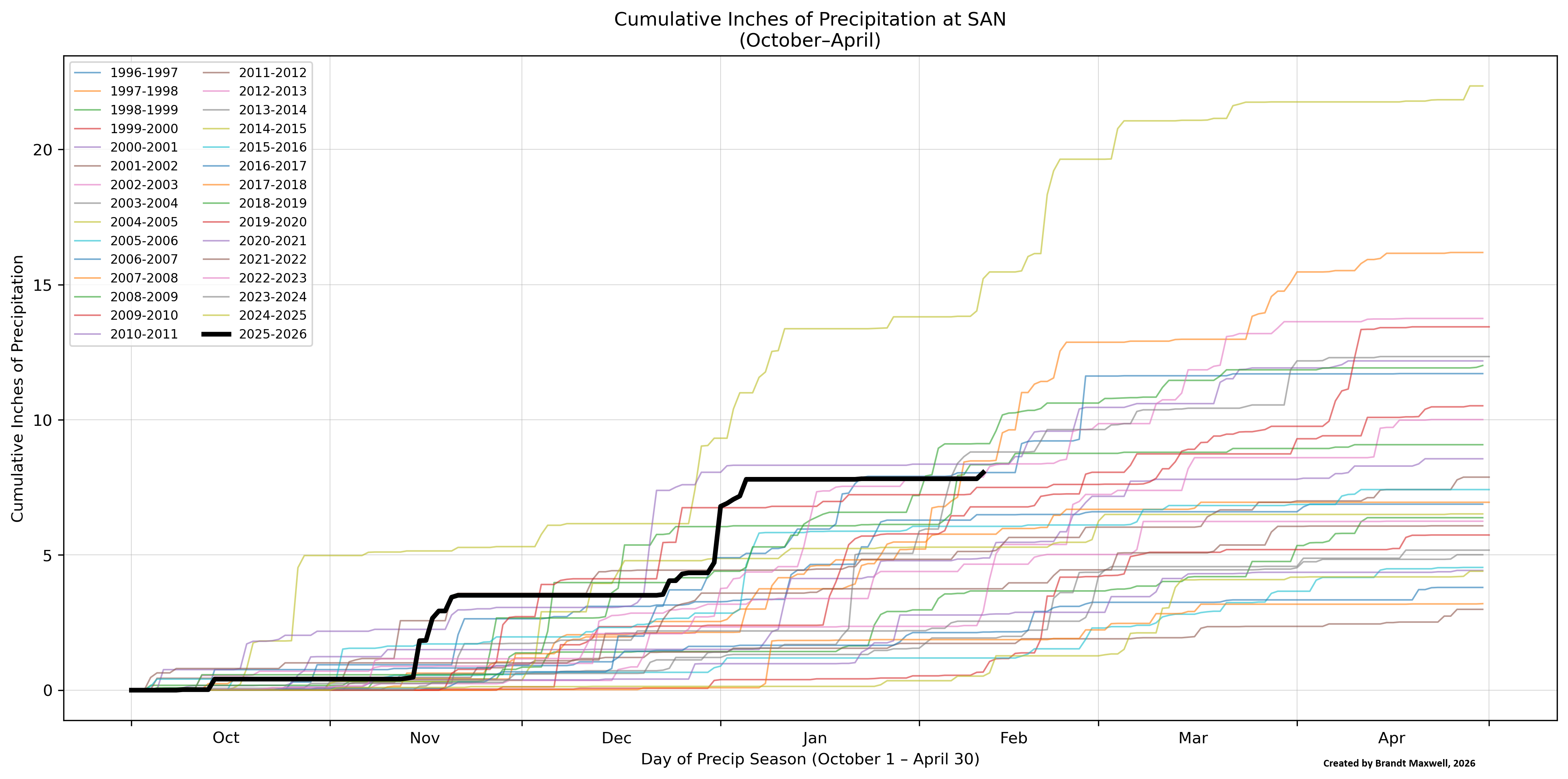 At one point in late November, we were #2 (compared to the years since 1996, 30 years ago) because of plentiful rains in mid-November, and we were #3 as recently as mid-January. As of today, we are #7, and officially at SAN, with 8.05" (2.35" above normal). Note that SAN got a bit "lucky" compared with even other parts of town (San Diego Montgomery Field, MYF, has actually had less rainfall despite being about 400 feet (120 meters) higher in elevation with 6.60" since 1 Oct 2025, only 0.34" above normal). You can't really tell which year each line represents easily (which isn't really the point here), but the highest line (thin green line) represents the very wet 2004-2005 season when 22.35" (568 mm) fell from October through April, while the thin purplish line represents the very dry 2001-2002 season when SAN fell just short of 3" (76 mm) from October through April. (Note that the x-axis just shows the month and not dates for less clutter and my perception of easier reading, but late November would be on the right side of the November part of the graph.)