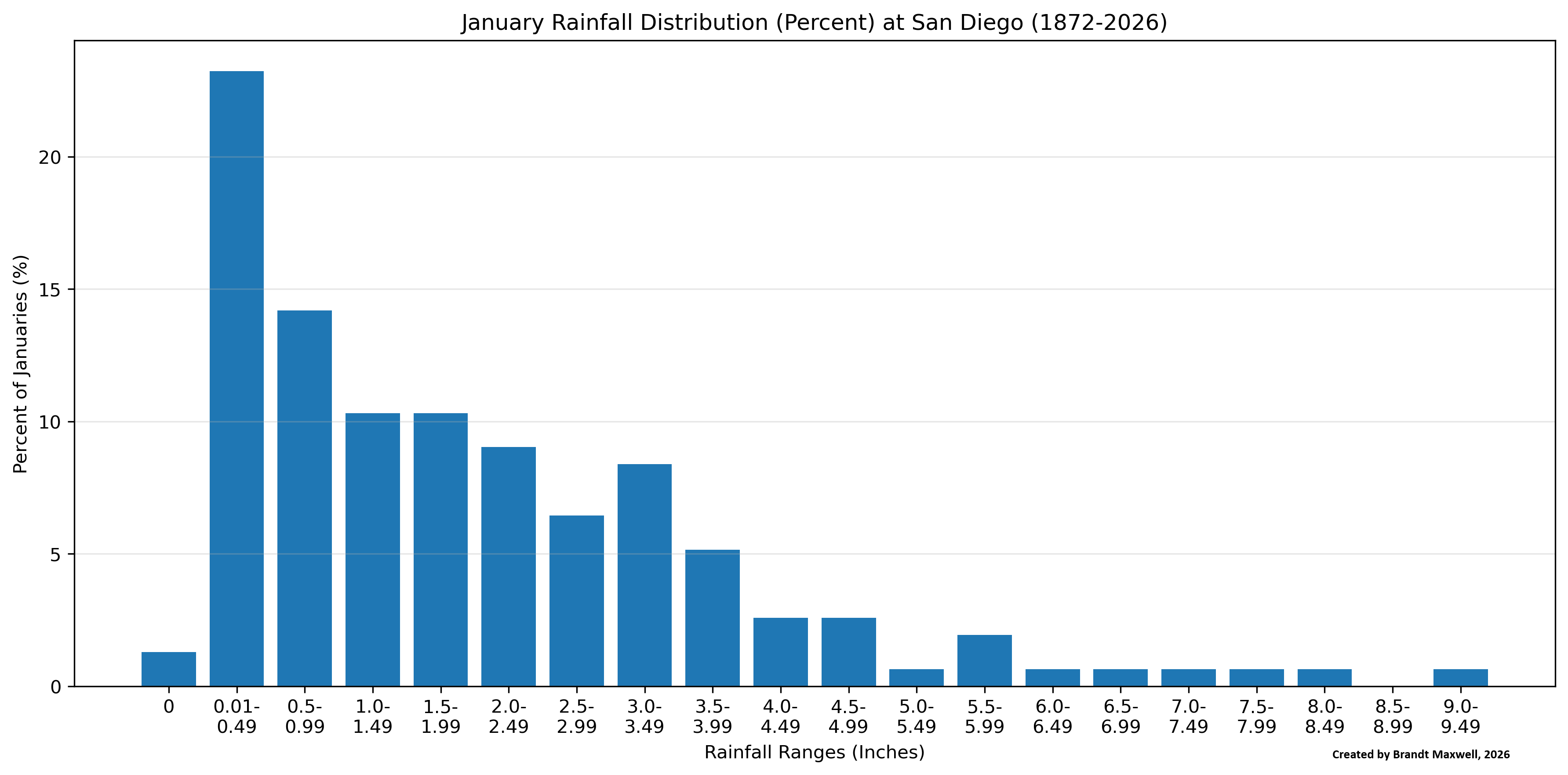 One can also look at the distribution of monthly precipitation, such as for January for SAN (going way back to 1872, when precipitation was measured downtown, versus the airport). Note that if one splits up precipitation into half inch increments, the most likely amount of monthly precipitation will be in the 0.01" to 0.49" range (and even a couple Januaries have had no measurable precipitation: 1948, 1976), even though the long-term average is just below 2 inches.