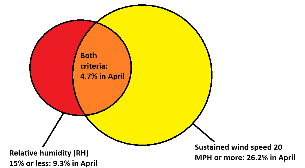 Now that we have seen the examples of strong winds and low humidity during the initiation of wildfires, we must ask how frequent these conditions are. In parts of the southern Plains, they are very frequent in late winter and spring, though much less frequent at other times of year. This is especially the case in the northern part of the Texas Panhandle; for example, Amarillo, Texas in April has sustained winds of 20 MPH or more (not even counting gusts!) 26.2% of the time, and relative humidity is 15 percent or less 9.3% of the time, based on hourly observations at the airport. The combination of the two occurs 4.7% of the time, which is equivalent to 34 hours per month, which is a lot of hours of critical fire weather.