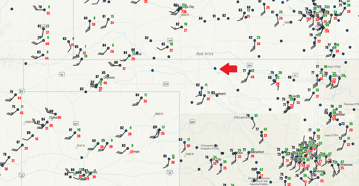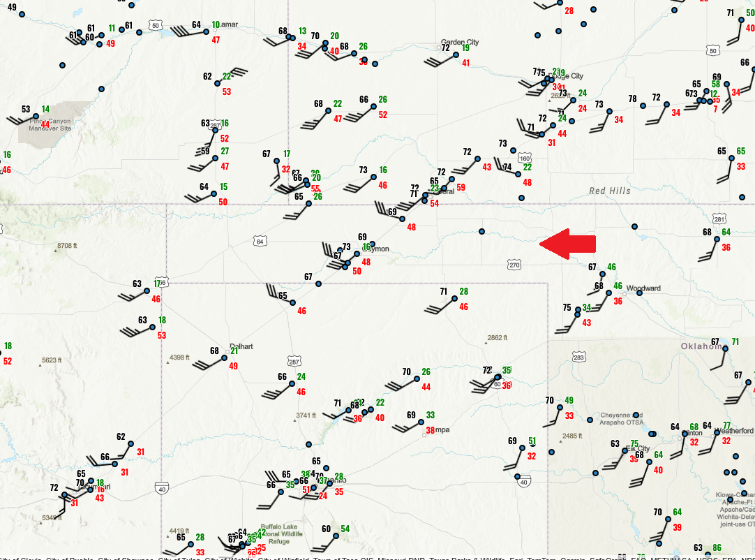 Here are the observations at 11 AM CST 6 Mar 2017 near the origination of the Starbuck Fire, the largest part of the Northwest Oklahoma Complex Fire.