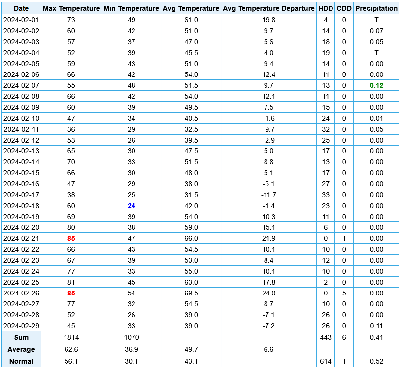 It is also important to look at the climate data for the month of February 2024. We will look at the data for Borger, a little over 10 miles (16 km) south of where the Smokehouse Creek fire started. The average temperature for February 2024 was 6.6° F/3.7° C above normal with only 0.30" (8 mm) of precipitation in the first 26 days of the month (leading up to the fire). While there were no extremely low temperatures that month (lowest was 24° F/-4° C), there were 4 days in mid-January with low temperatures in the single digits (lowest was 2° F/-17° C) which would have assured dormancy. The station at Borger doesn't report snowfall, but Amarillo, approximately 40 miles (64 km) to the southwest of Borger, received 5.6 inches (14 cm) on 11 Feb 2024, but Borger likely received very little snow given that only 0.05" (1 mm) of precipitation fell, and if any snow fell, it would not have remained on the ground long (measurable snow was only on the ground for 2 days at Amarillo, and during the rest of the fall and winter of 2023-2024, Amarillo had less than 2 inches (5 cm) of snowfall). Despite this, the Drought Monitor had no drought for the area affected by the Smokehouse Creek Fire (not even "D0" for "abnormally dry"), and drought is not a requirement for parched vegetation in that area given that there is not normally much precipitation at that time of year (the average for February is 0.52" (13 mm)), and vegetation will be dormant anyway due to the winter freezes.
