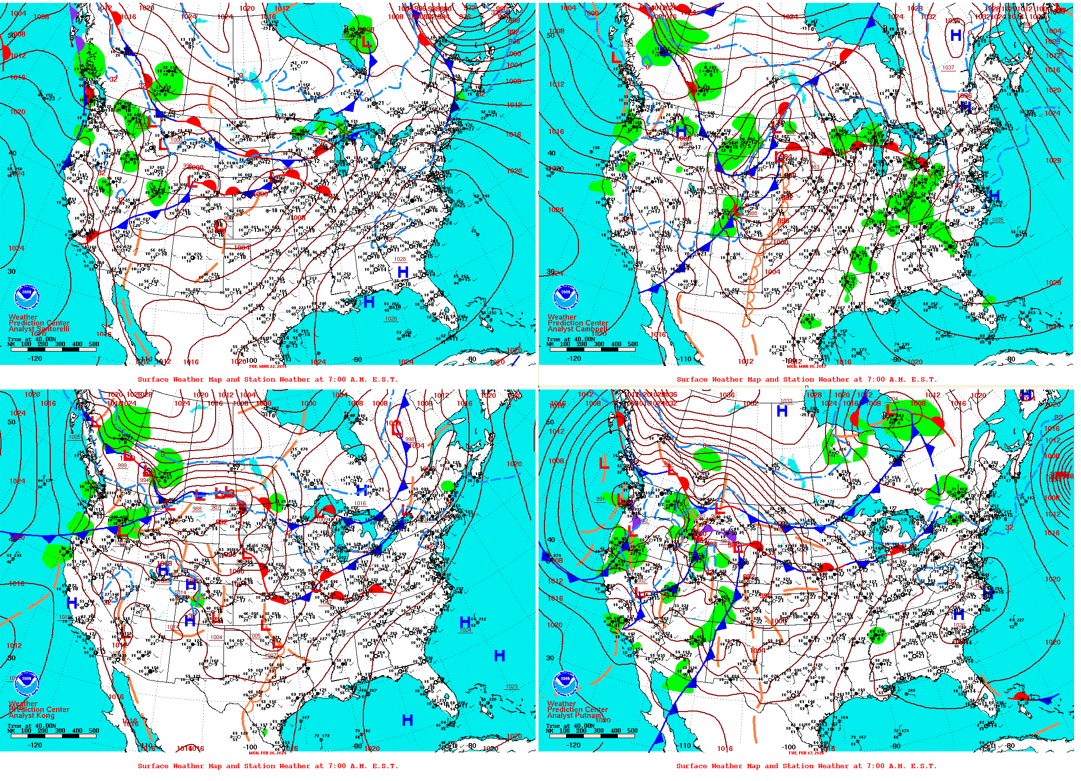 One complication of the weather patterns: they never quite look the same for each of the major wildfires. See the daily weather maps below (from the National Weather Service's Weather Prediction Center (https://www.wpc.ncep.noaa.gov/dailywxmap/--an easy reference for archived surface and 500 millibar (approx. 4 miles/6 km above the surface) maps) to see the variety of surface patterns for the four early mornings before the above mentioned wildfire starts (remember to click on the map for a bigger image, necessary in this case, and the order is 22 Mar 2016 (upper-left), 6 Mar 2017 (upper-right), 26 Feb 2024 (lower-left), and 17 Feb 2026 (lower-right)):