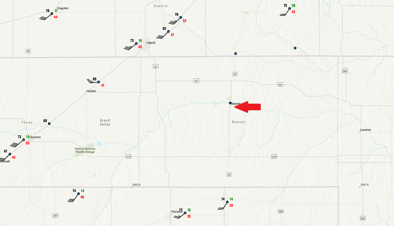 Now we go to the recent fire, the Ranger Road Fire, which started in the Oklahoma Panhandle, very close to Beaver, and rapidly spread to the northeast into Kansas with more than half its 283283 acre/114641 hectare coverage having been burned in the first nine hours. Here are the observations at 11 AM CST 17 Feb 2026 near the Ranger Road Fire, about 40 minutes before ignition.