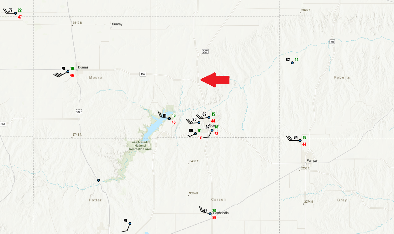 We will look at these fires from largest to smallest, so let's start with the Smokehouse Creek fire of 2024. The observation map (from the National Weather Service Weather and Hazards viewer archive) is from 2 PM CST 26 Feb 2024, shortly before the official ignition time of 220 PM, with ignition occurring where the red arrow points. In case you need a review on reading the wind barbs below, one is here: https://www.weather.gov/hfo/windbarbinfo. The numbers show the temperature (°F, in black, left of the dot), wind gust (MPH, in red, lower-right) and relative humidity (%, in green, upper-right). The wind barbs are in knots (1 knot=1.15 MPH), despite the gusts being listed in MPH.