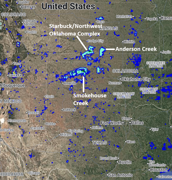 The southern Great Plains (from the Texas Panhandle to southwestern Kansas) gets a lot of large, fast-moving, wildfires in late winter and early spring. For the 10 years between 2016 and 2025, the Smokehouse Creek fire (2024) in the Texas panhandle was the fire with the greatest amount of acreage in the United States (1058482 acres/428352 hectares), while the Northwestern Oklahoma Complex (2017), most of which was also called the Starbuck Fire, which included not just northwestern Oklahoma but even more acreage in southwestern Kansas, was #5 among all 2016-2025 U.S. fires with 779292 acres/315368 hectares, and the Anderson Creek Fire (2026) in northwestern Oklahoma and south-central Kansas, was #9 with 400000 acres/160000 hectares. More recently, in February 2026 (and what inspired this blog entry), several fires broke out in Oklahoma and Kansas, including the Ranger Road Fire at 283283 acres/114641 hectares. Here's a map of at least the 2016 through 2024 wildfire burn areas over that general area (from https://lcms-viewer.fs2c.usda.gov/mtbs.html with the major fires labeled):